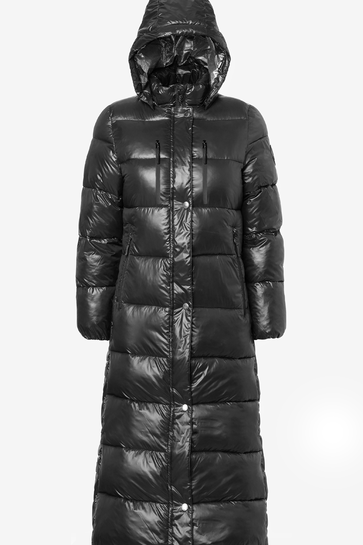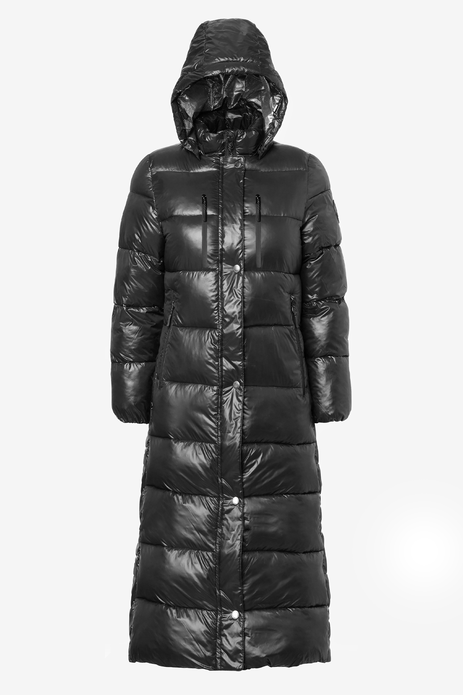 Lange, wattierte Jacke mit hohen Seitenschlitzen. Reflektierende Details, mehrere Fronttaschen mit wasserdichten Reißverschlüssen und eine schützende, abnehmbare Kapuze.