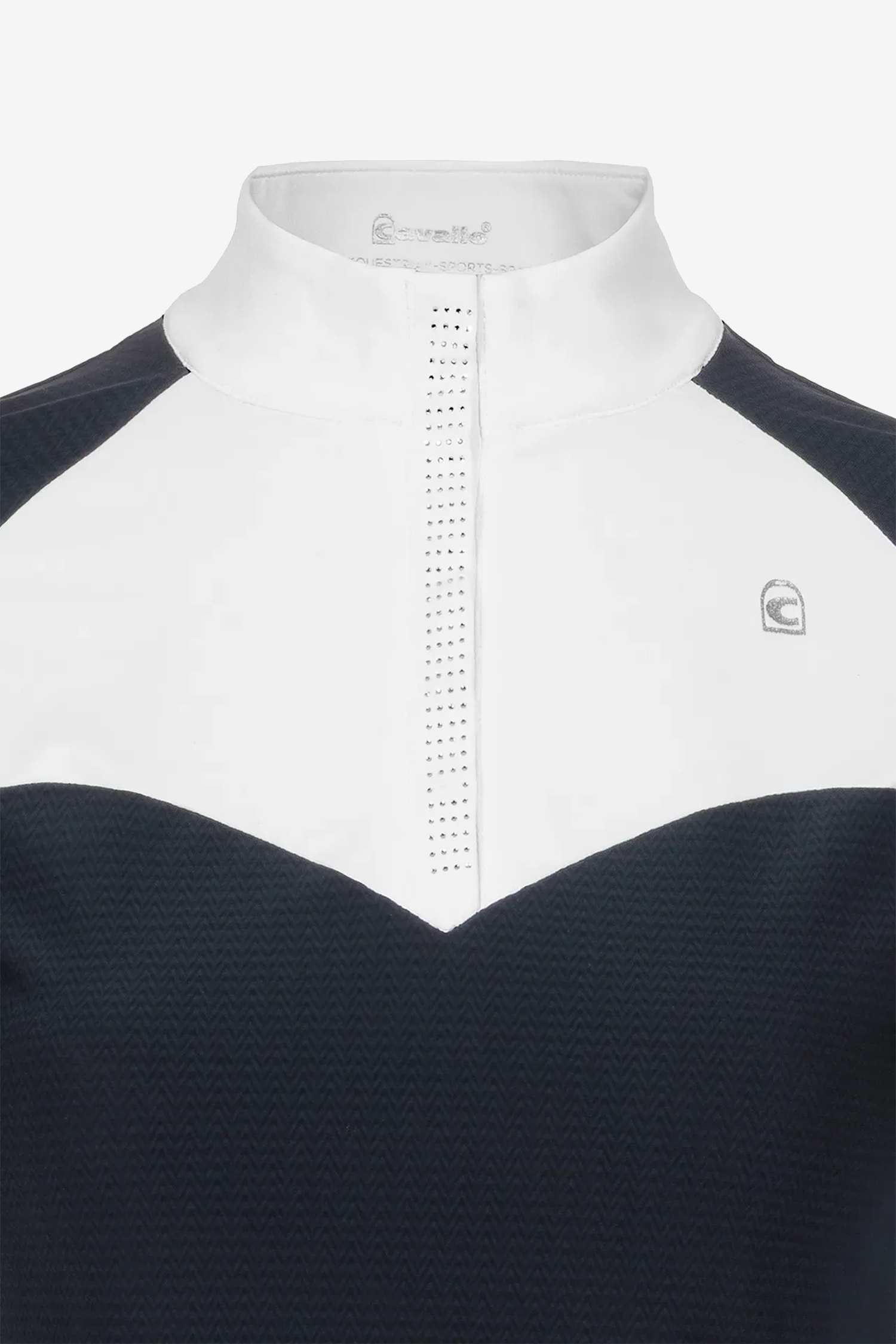 CAVALBRISA konkurrence top er en elegant og funktionel kortærmet konkurrenceskjorte, der kombinerer stil med høj ydeevne. Den er fremstillet i et teknisk materiale, der er åndbart og hurtigtørrende, hvilket gør den perfekt til intense konkurrencedage.