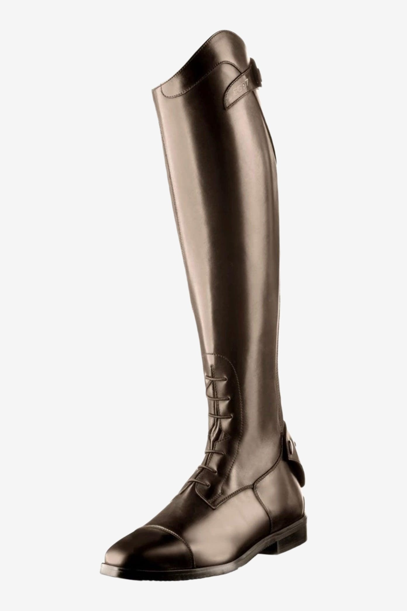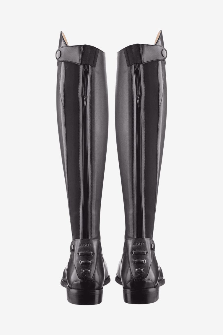 Støvlerne er fremstillet af høj kvalitet full grain læder og ekstra blødt læder over vristen for øget komfort. Hel lynlås af ekstra stærkt materiale bagtil med elastik giver en stabil og høj komfort med bevægelsesfrihed og pasform som en skræddersyet støvle. På indersiden af læggen er full grain læderet erstattet med det innovative og meget slidstærke E-tex materiale. Det beskytter dels læggen bedre og giver også et godt greb og kontakt med hesten og sadlen. Bagtil er der en sporestøtte i plast med tre forskellige indstillinger for sporen, der holder den fast på plads.