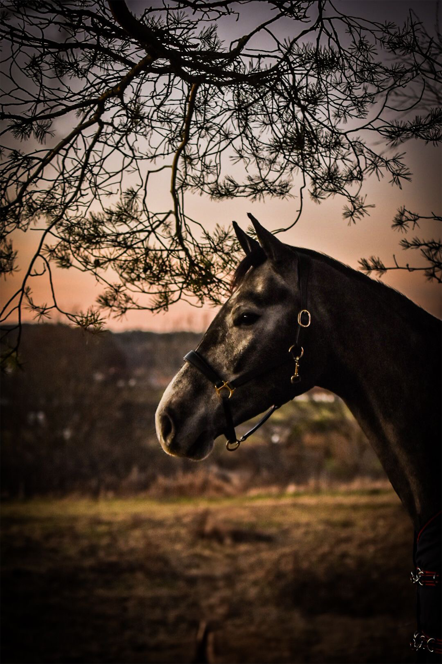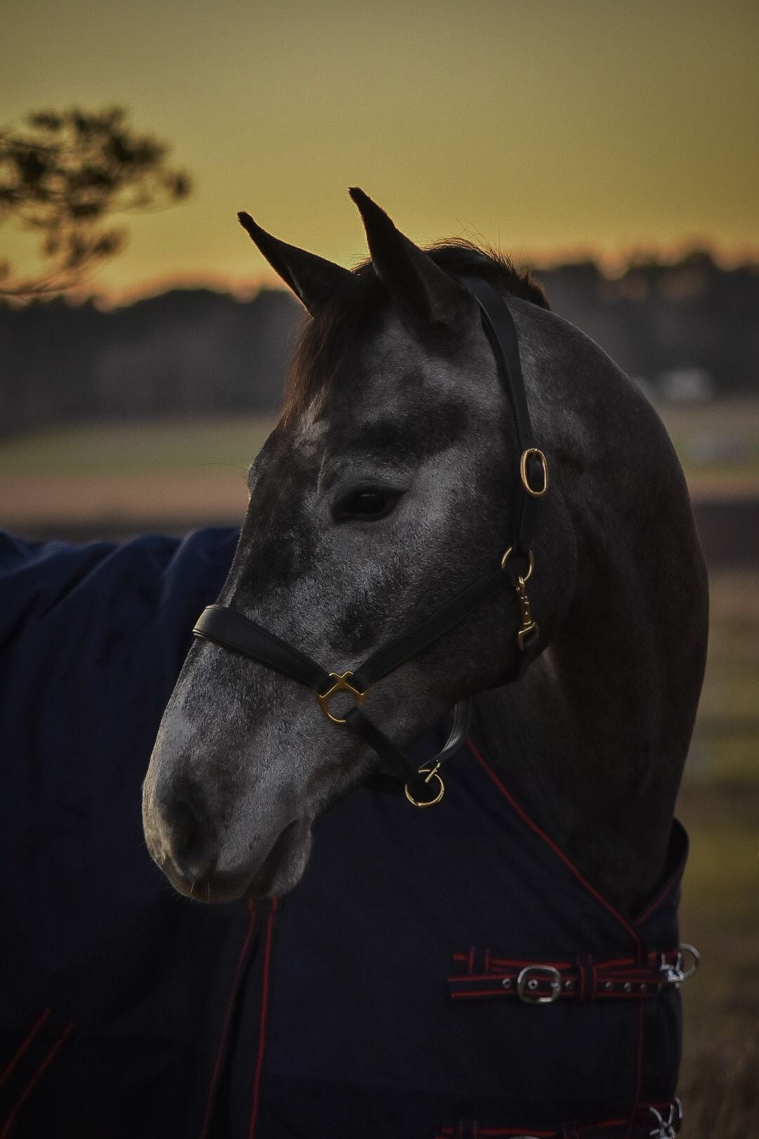 En lædergrime, fremstillet af høj kvalitet læder, tilbyder både komfort og holdbarhed, perfekt til daglig brug eller specielle lejligheder. De guldfarvede detaljer på spænderne og ringene giver en luksuriøs finish, der fanger øjet i stalden og til konkurrencer.