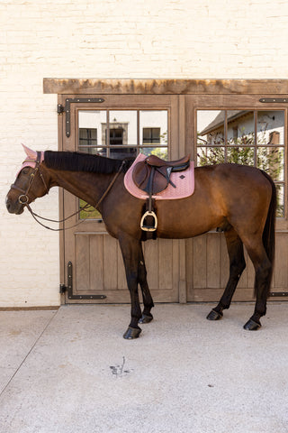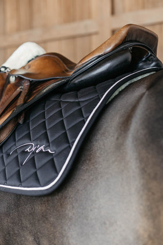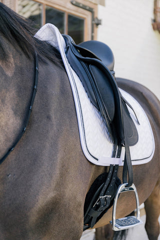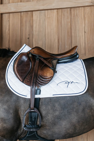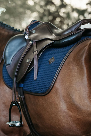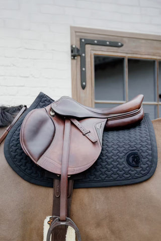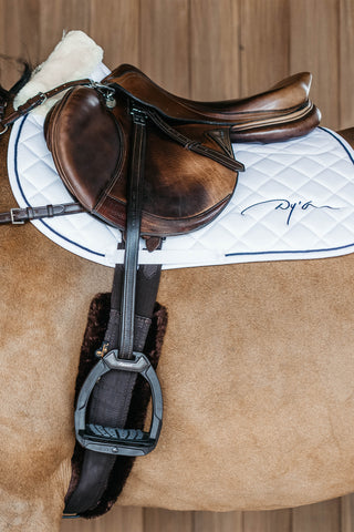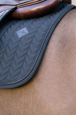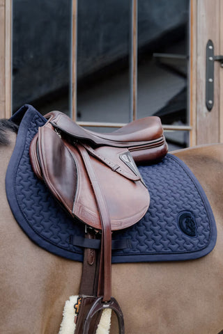 A jumping saddle pad is a specially designed saddle pad used for show jumping. It is usually anatomically shaped to provide extra freedom at the withers and is shorter than all-purpose or dressage pads, so that it fits a jumping saddle. How do you know if the pad fits your saddle? Make sure the pad does not slip, lies evenly under the saddle, and does not press on the withers. Jumping saddle pads come in a variety of colors, patterns, and materials – perfect for matching the rest of your equipment.