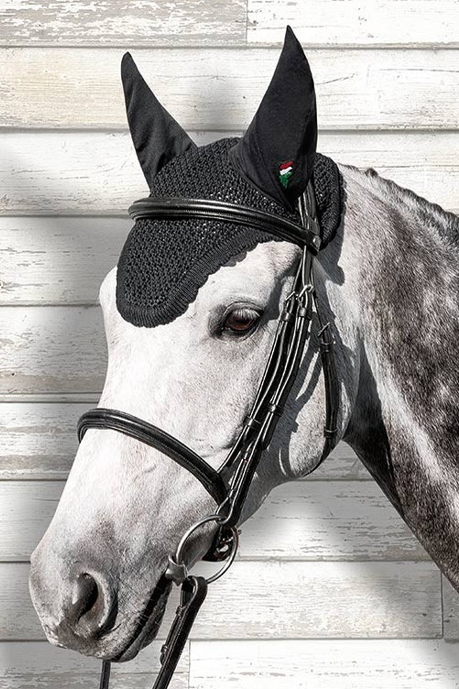 Crocheted ear bonnet from Equiline. The classic three horses on the lower edge of the left ear. Slightly elastic ears.