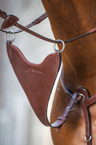 A stylish and simple breastplate from Dyon. The breastplate attaches to the front of the saddle and has an elastic section that improves fit and freedom of movement. The leather is Dyons premium leather from Spain and the breastplate features beautiful details with raised sections and stitching finished with silver buckles.