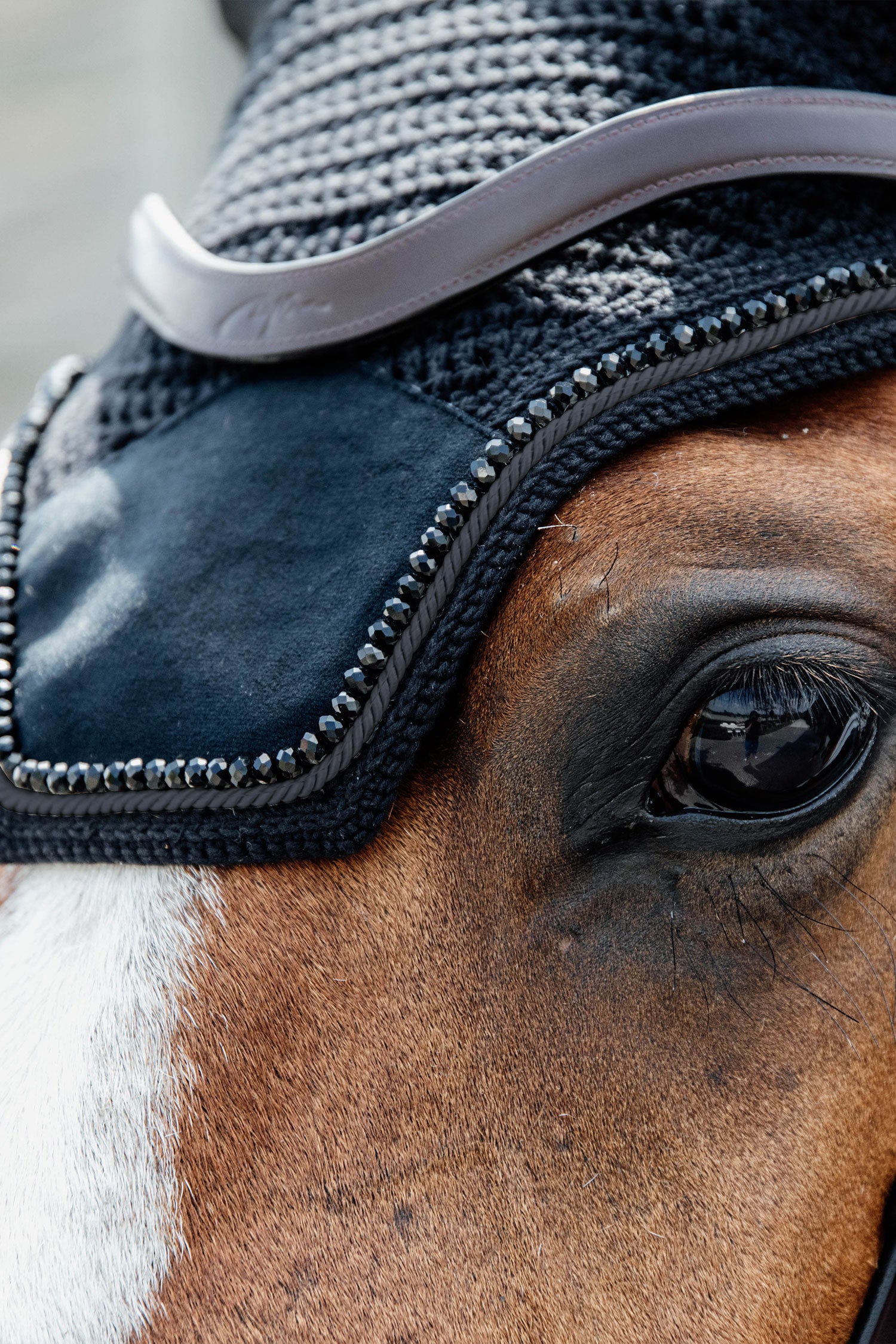 Classic and stylish competition fly veil from Kentucky with beautiful details and stitching. Extended neck section to prevent it from slipping under the bridle and to ensure it stays securely in place.