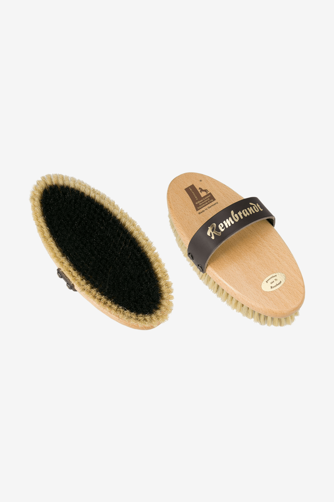 Since the brush is made only of natural materials, the horse's coat is perfectly maintained and no electrostatic charge is generated. The brush is made of PEFC-certified lacquered beech wood and is also treated for an antibacterial effect. The strap over the back of the hand is made of premium leather that is comfortable against the hand and can also be shortened in length if needed.