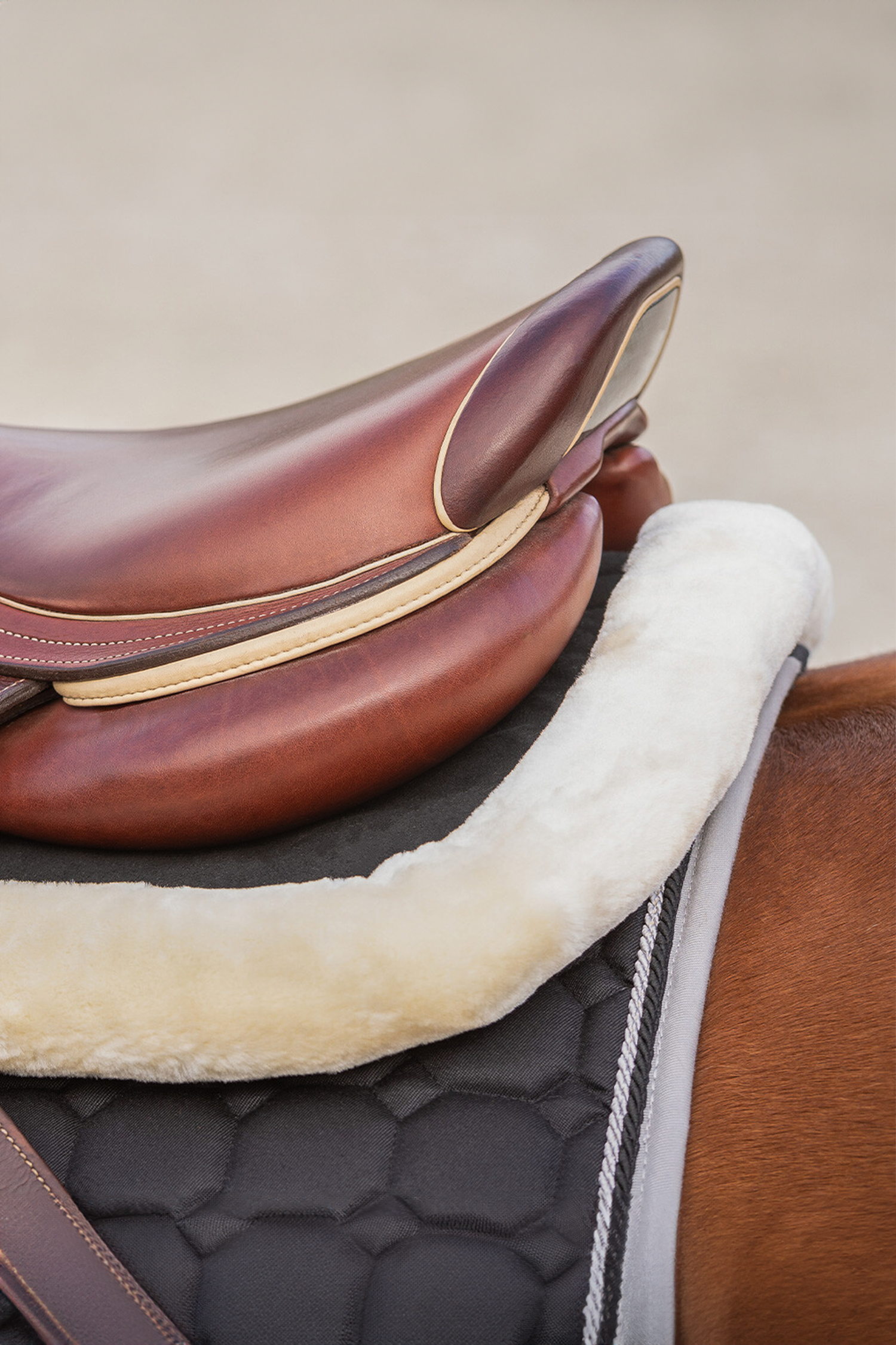 La face supérieure en matériau type suédine offre une bonne adhérence à la selle, tandis que la face inférieure en polaire aide à maintenir le tapis bien en place. Le bord doux en fourrure synthétique au niveau du garrot et à l'arrière augmente le confort et réduit le risque de pression.
