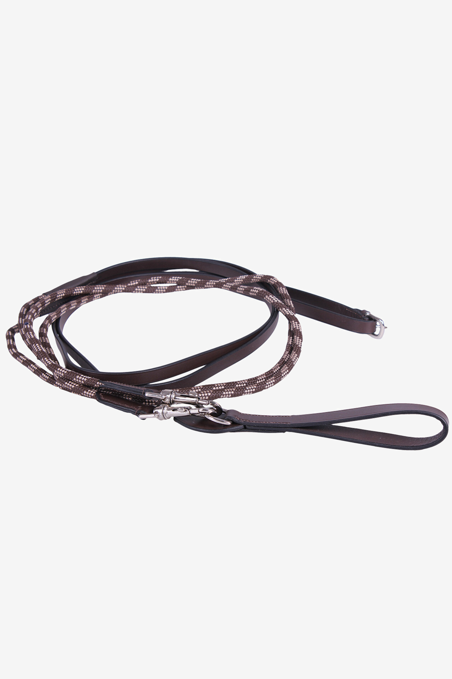 Fabriquées en cuir souple et résistant avec une corde bicolore en polypropylène qui offre à la fois durabilité et élégance. Équipées d'une boucle de sangle avec anneau en D pour une fixation facile ainsi que de deux crochets robustes couleur argent pour attacher facilement les rênes au mors.