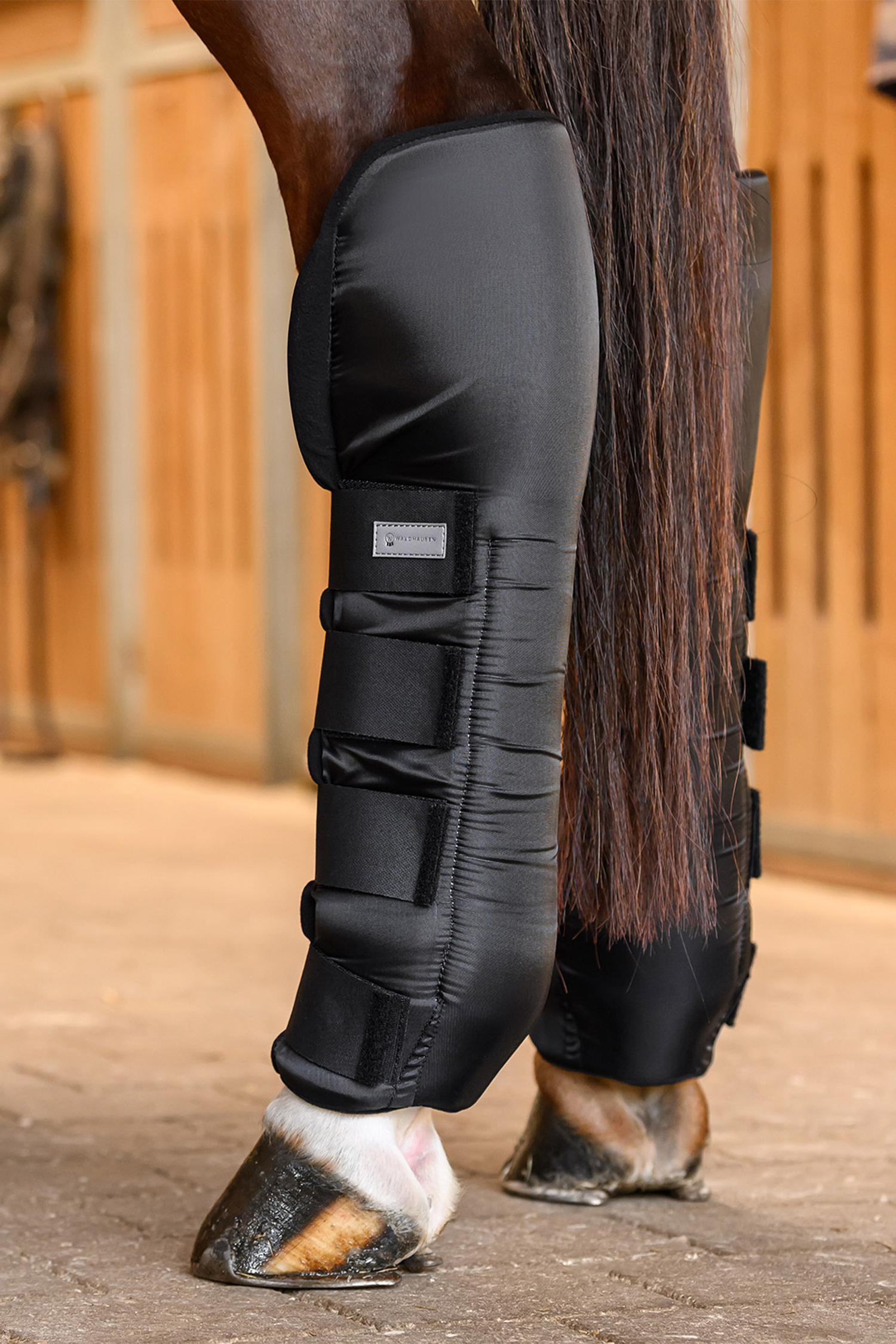 La conception ergonomique offre une bonne liberté de mouvement même lorsque le cheval est couché, tandis que les matériaux robustes garantissent que les protections conservent leur forme. Le matériau extérieur déperlant est associé à une doublure intérieure douce pour un grand confort. La construction amortissante protège contre les chocs et la pression, tandis que le matériau procure une chaleur légère et une compression qui peuvent favoriser la circulation sanguine et la récupération.