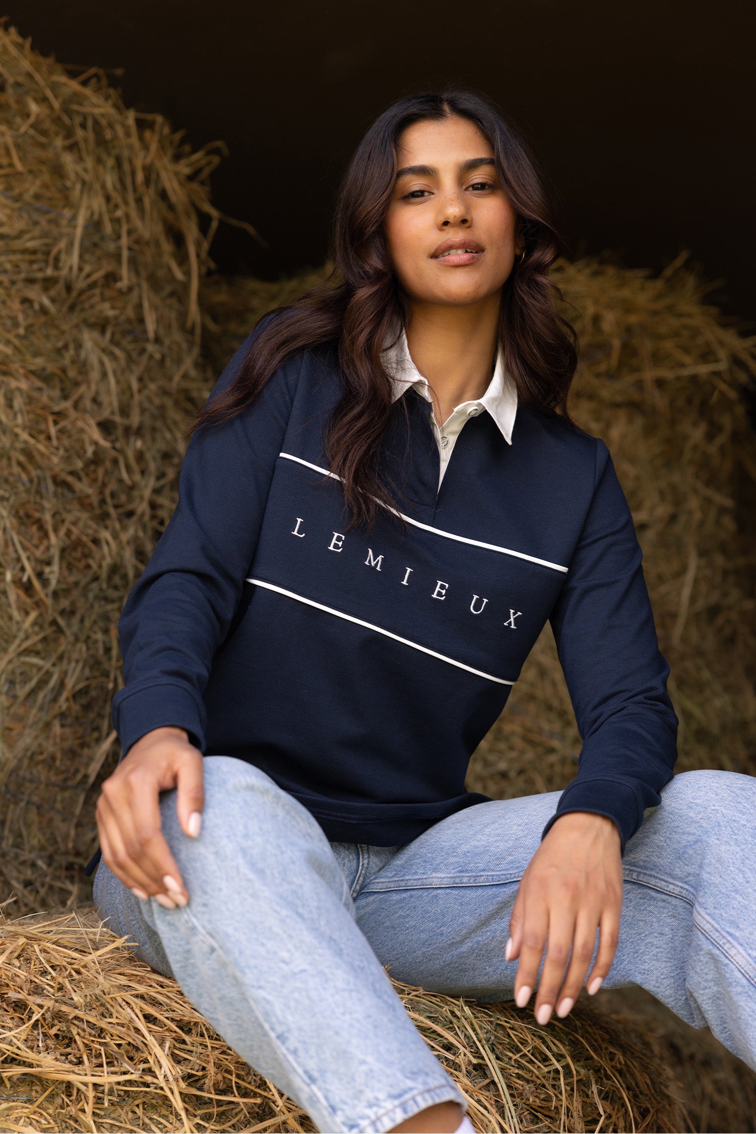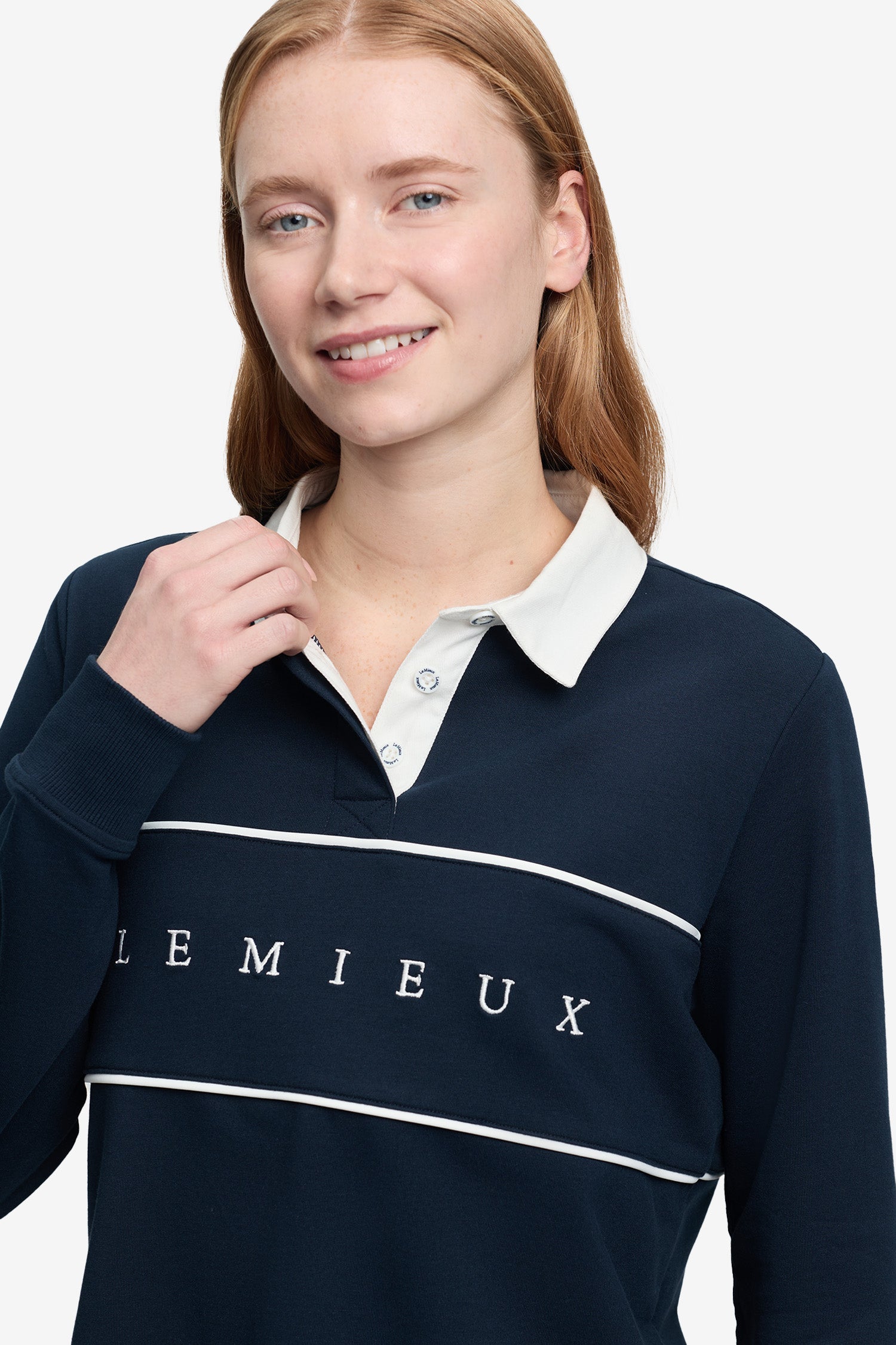 De royale pasvorm creëert een licht boxy silhouet dat mooi over het lichaam valt, waardoor de trui zowel comfortabel als flatterend is. De klassieke katoenen kraag met witte knopen en subtiele LeMieux-branding zorgt voor een stijlvolle afwerking die zowel in de stal als dagelijks goed past.
