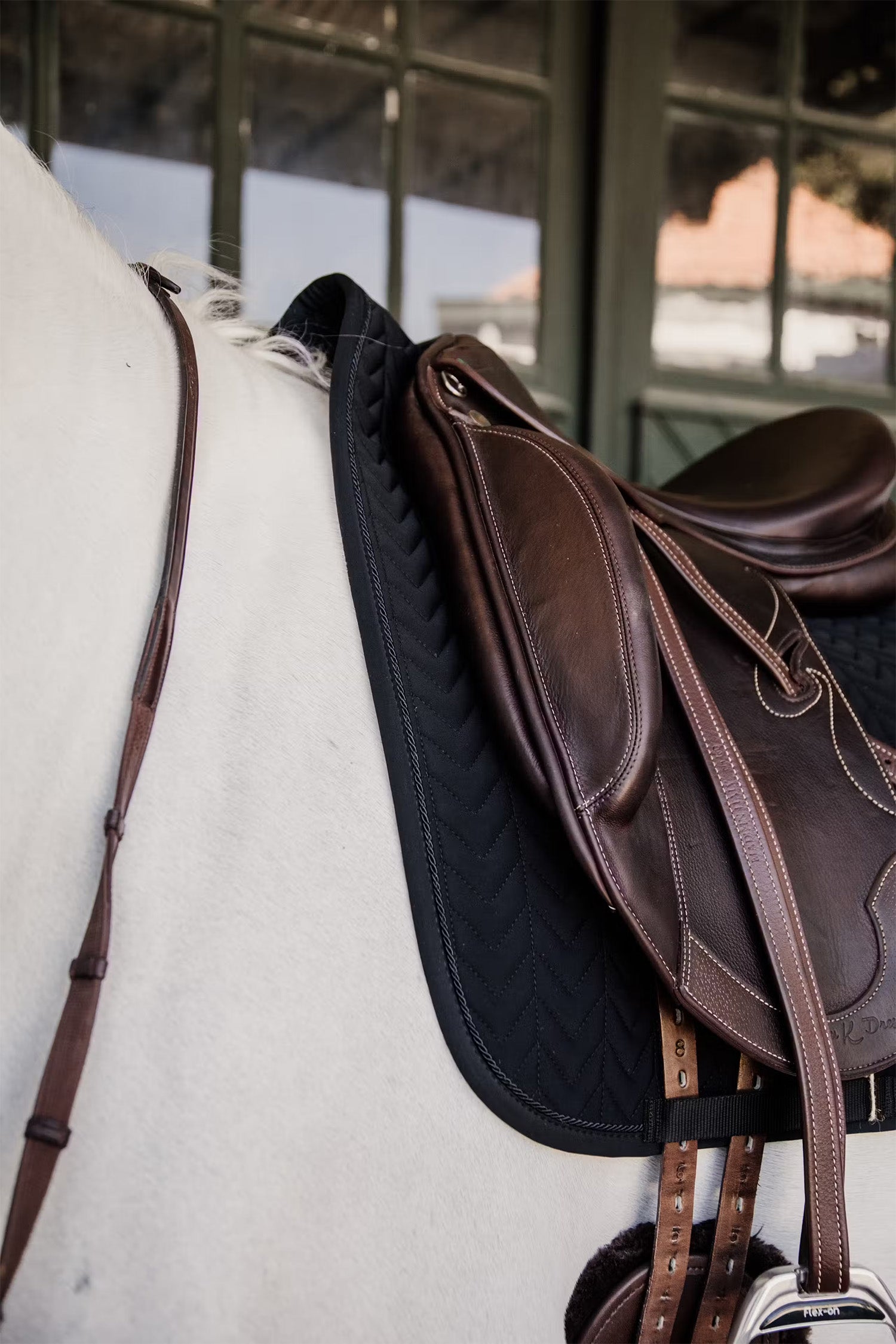 Dit zadeldek heeft een subtiel leren logo in dezelfde kleur als het dek, en biedt nog steeds voldoende ruimte voor borduurwerk indien nodig.