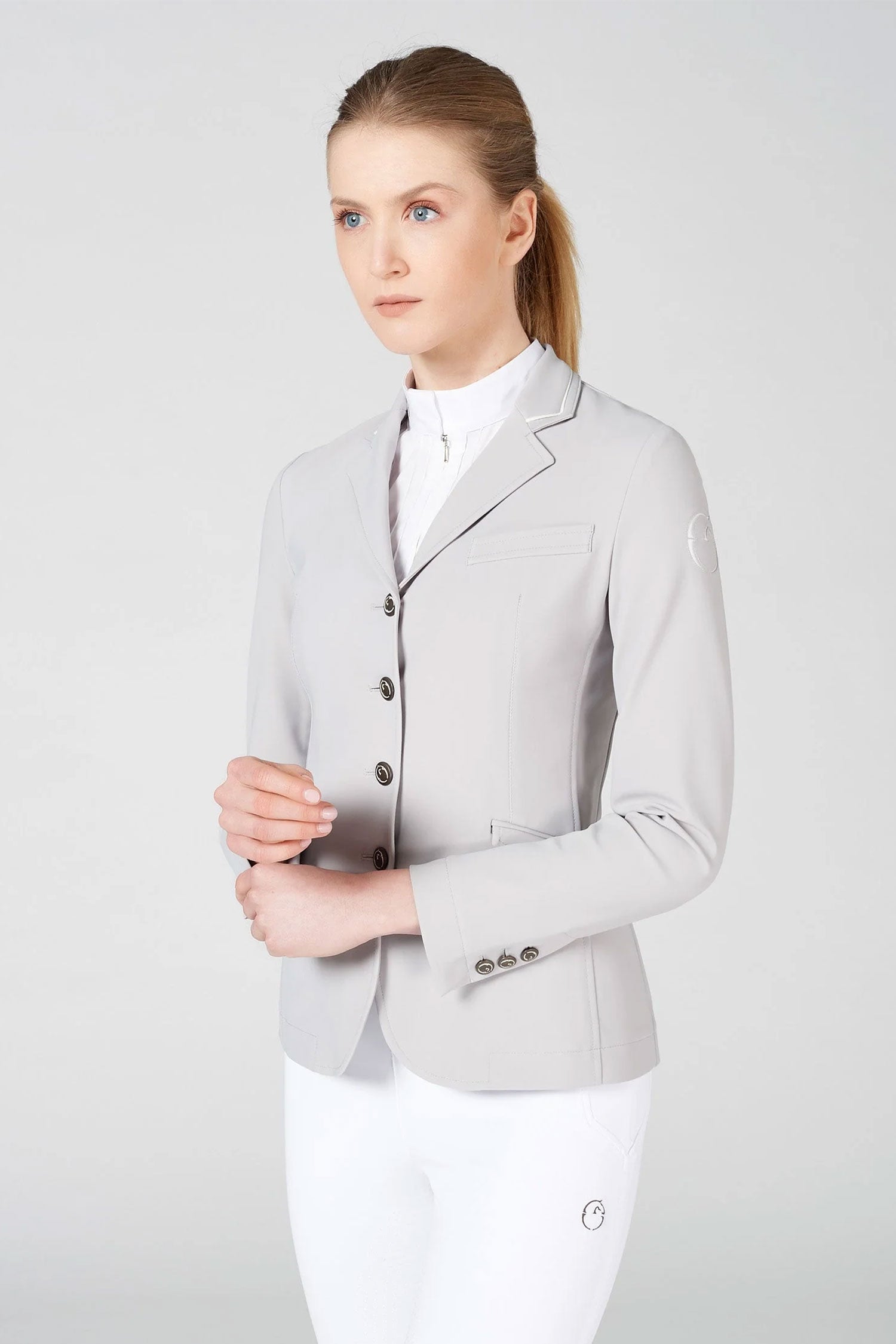 Ongelooflijk stijlvolle en perfect getailleerde wedstrijdjas met vier knopen aan de voorkant en een verborgen rits. Gemaakt van de beste kwaliteit bi-stretch technisch materiaal.
