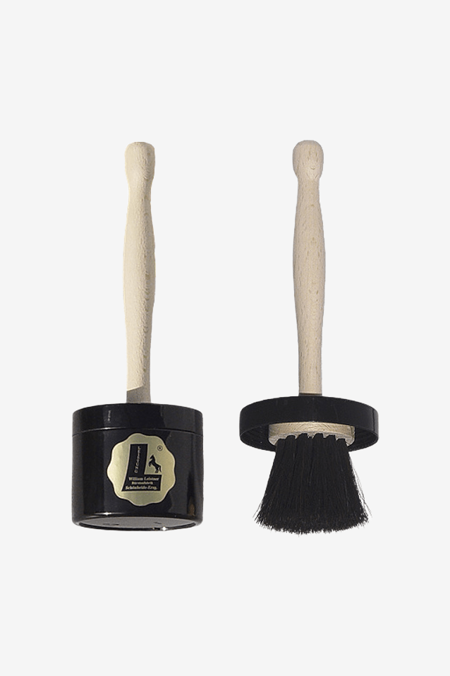 Hufbürste mit Holzgriff, die sich einfach in den mitgelieferten Kunststoffbehälter einschrauben lässt. Minimieren Sie Schmutz und Verschütten, indem Sie die Bürste immer verschlossen aufbewahren. 100% Pferdehaar.